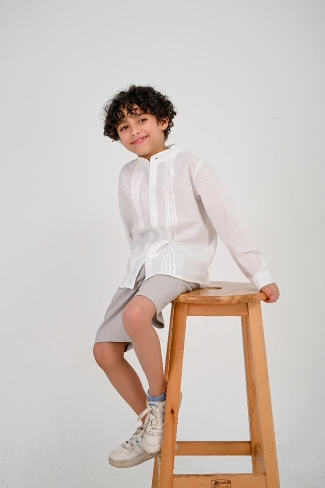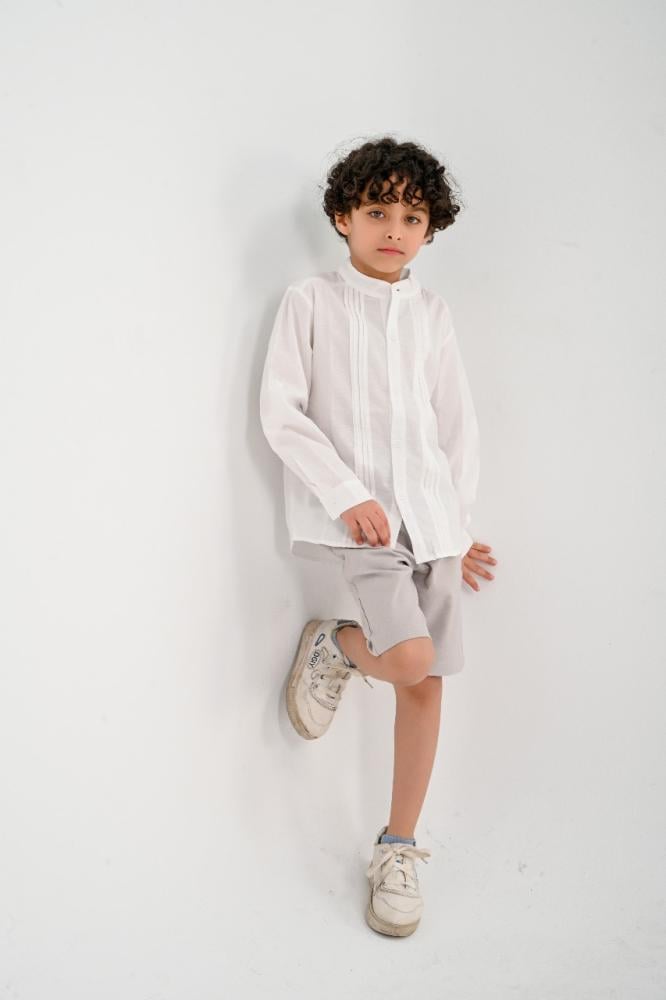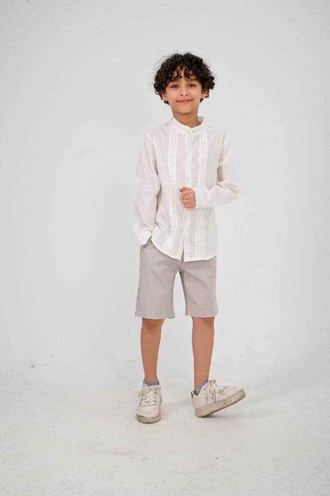 • القميص: أبيض كتان بأكمام طويلة، مزين بكسرات أمامية أنيقة وأزرار لإضفاء لمسة كلاسيكية فريدة.