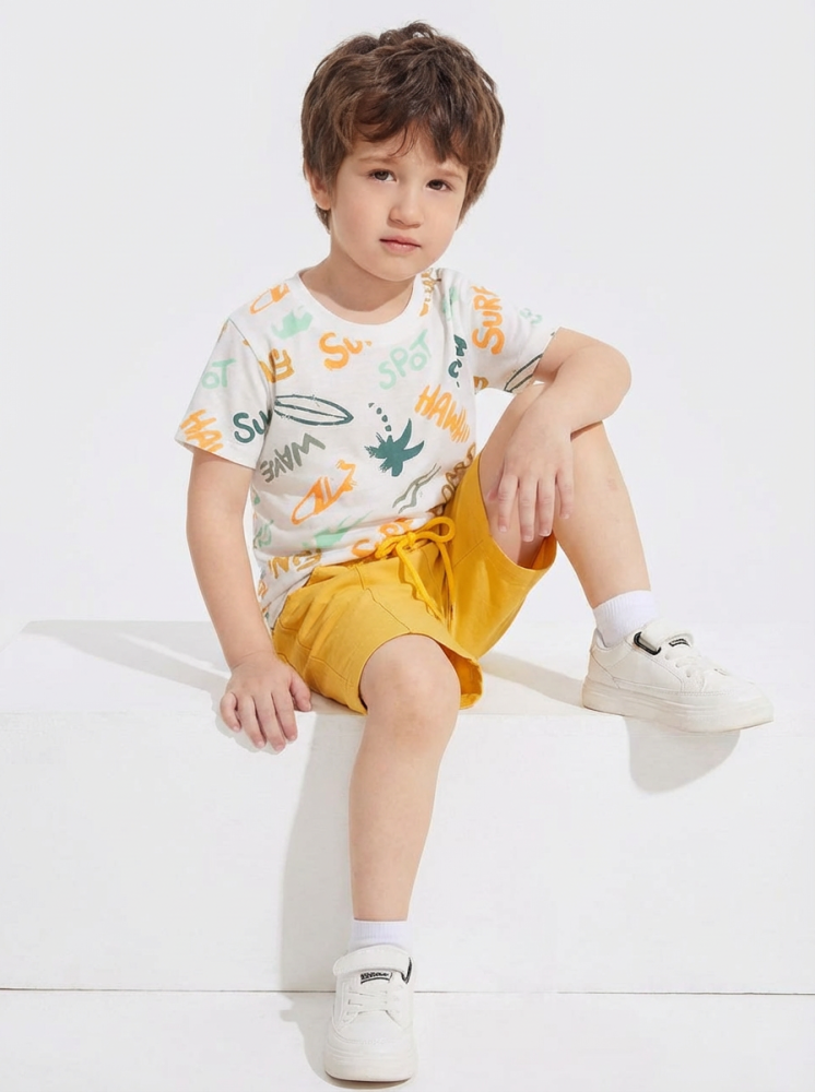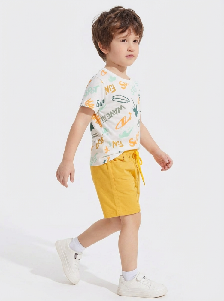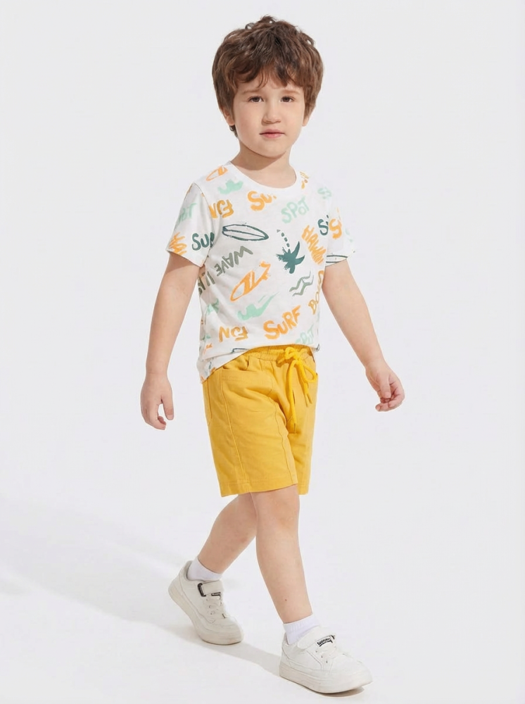 اجعل طفلك مستعدًا لأجواء الصيف مع طقم روح الصيف تيشرت أبيض منقوش وشورت أصفر، المصمم للأولاد من 3 إلى 14 سنة. يتميز الطقم بألوان مبهجة وتصميم عصري يعكس الحيوية والنشاط الصيفي، مع خامة قطنية ناعمة تسمح بحرية الحركة طوال اليوم.
