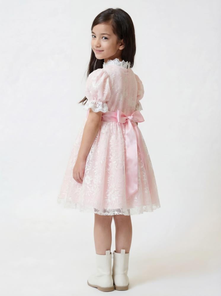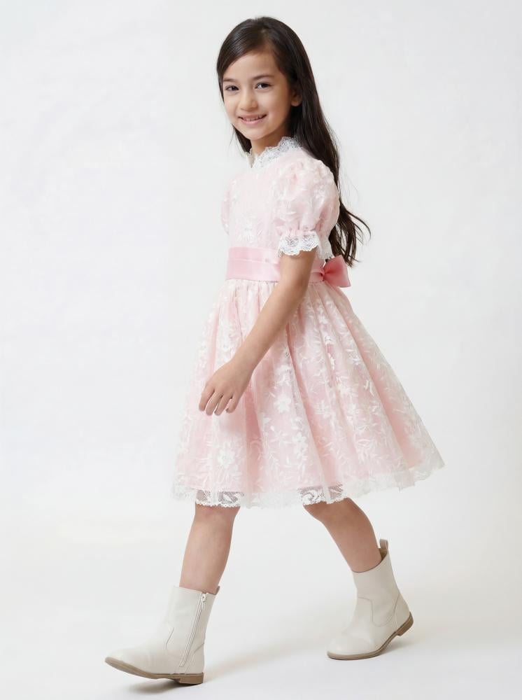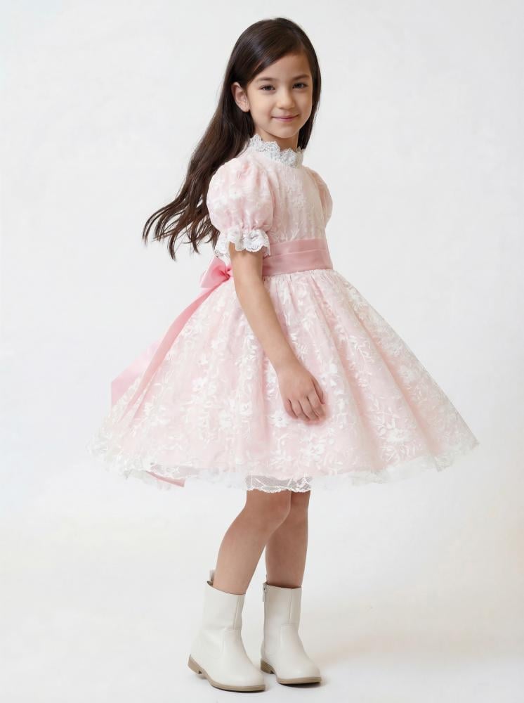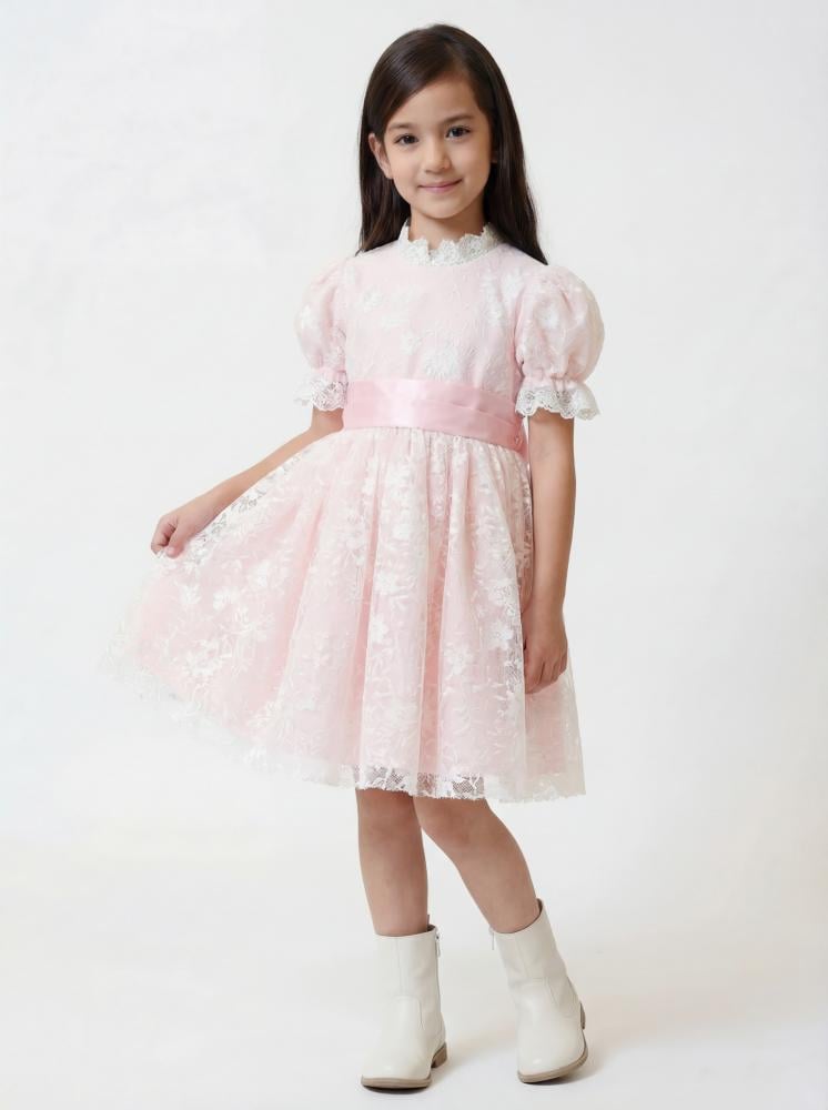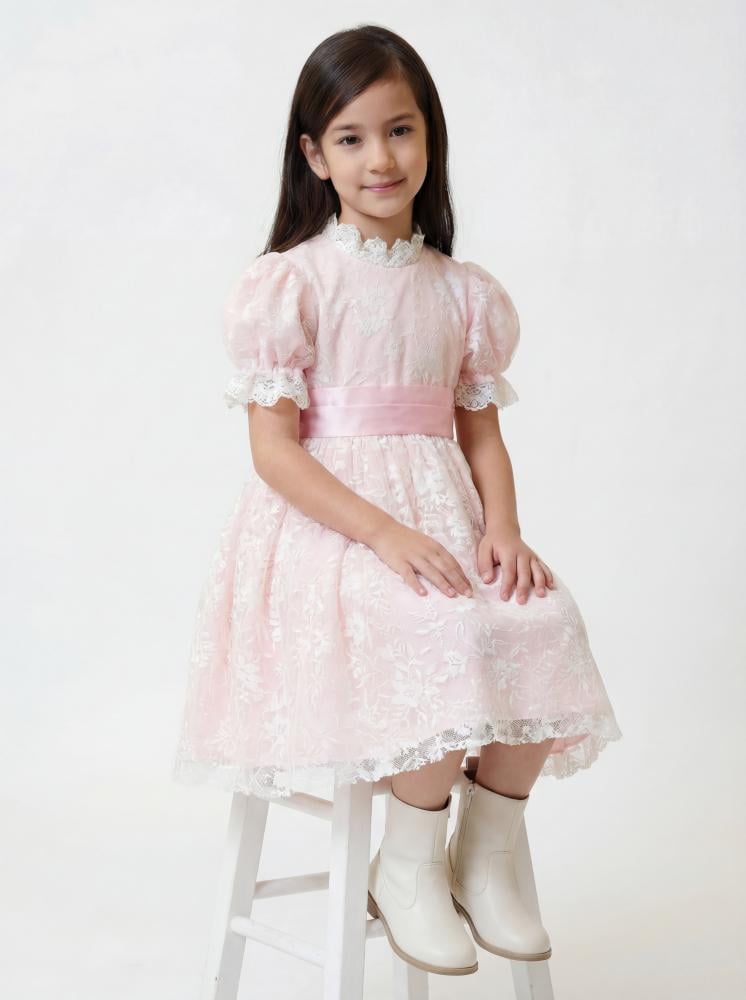 فستان بناتي أنيق بلون وردي ناعم، بتصميم دانتيل راقٍ يعكس براءة الطفولة وأناقتها. يتميّز بقصة واسعة وتنورة منسدلة تضيف حركة جميلة، مع تفاصيل كشكش وأكمام ناعمة تجعل الإطلالة مثالية للمناسبات الخاصة والاحتفالات.