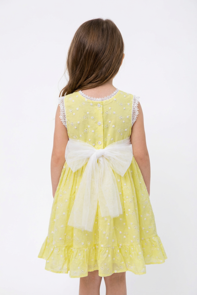 لون أصفر ملكي ناعم، دانتيل فاخر، ورباط تول أنيق من الخلف يضيف لمسة فخامة راقية.