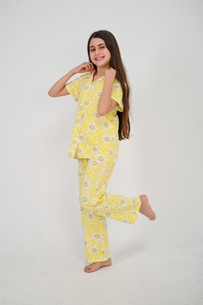 بجامة بناتي مشرقة بتصميم مستوحى من زهور الأقحوان الجميلة. التيشيرت يتميز بياقة على شكل V وأكمام قصيرة لمظهر أنيق ومريح، بينما البنطال مزين بالكامل بنقوش زهور الأقحوان البيضاء على خلفية صفراء مشرقة، مما يمنح إحساسًا بالحيوية والانتعاش. مصنوعة من قماش قطني ناعم يمنح راحة تامة أثناء النوم أو الاسترخاء، ولا تسبب أي حساسية للبشرة، مما يجعلها مثالية للأطفال.
