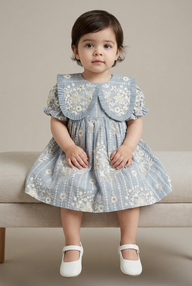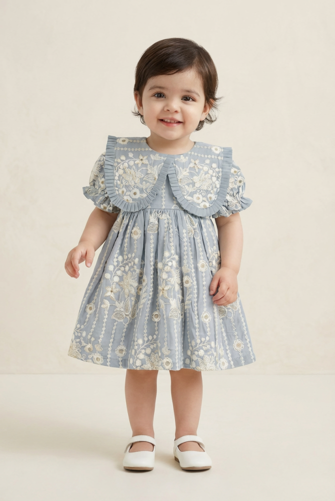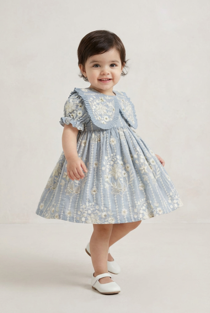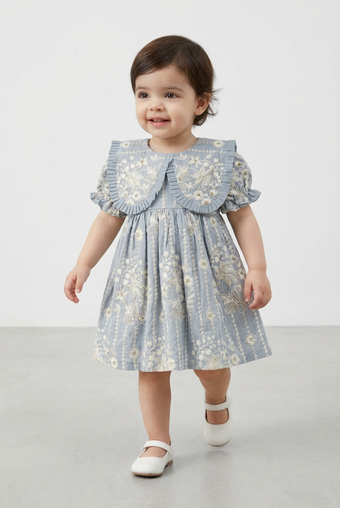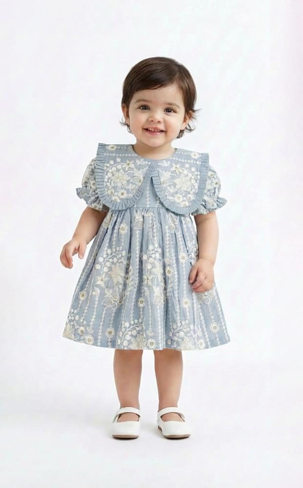 التصميم مزين بتفاصيل تطريز ونقشات ناعمة تضيف لمسة أنثوية رقيقة بدون تكلف، مع ياقة وأكمام مصممة بعناية لتعطي شكلًا كلاسيكيًا محببًا للأطفال. القبعة المرفقة تكمل الإطلالة بشكل جميل .