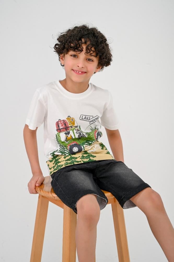 • التيشيرت: أبيض برسومات سيارة رحلات وأشجار، بتصميم مريح يعكس أجواء المغامرة.