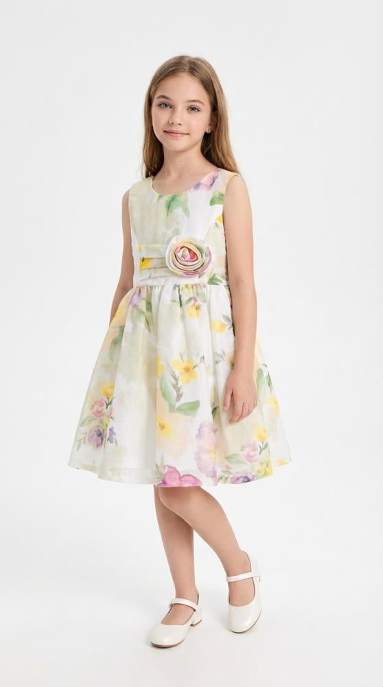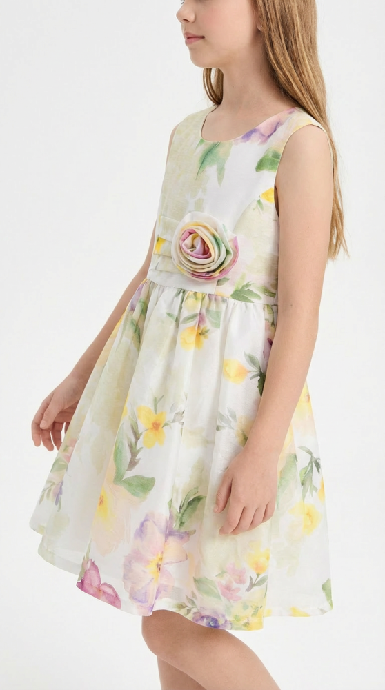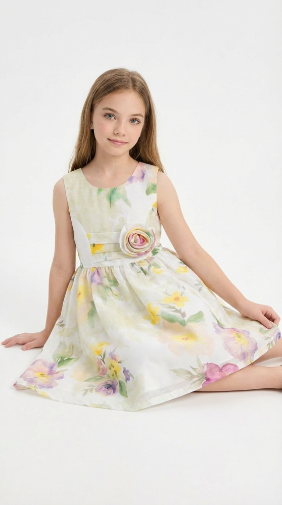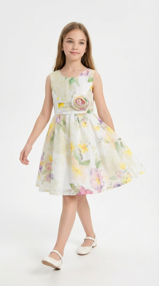 فستان بتصميم ناعم وخفيف، يتميّز بطبعة زهور بألوان هادئة ولمسة أنثوية رقيقة. القماش الشفاف بإنسداله الطبيعي يمنح الفستان حركة جميلة، بينما تضيف الوردة القماشية عند الخصر تفصيلاً بسيطًا يلفت النظر بدون مبالغة. قطعة تجمع بين البساطة والذوق الهادئ لإطلالة طفولية أنيقة .