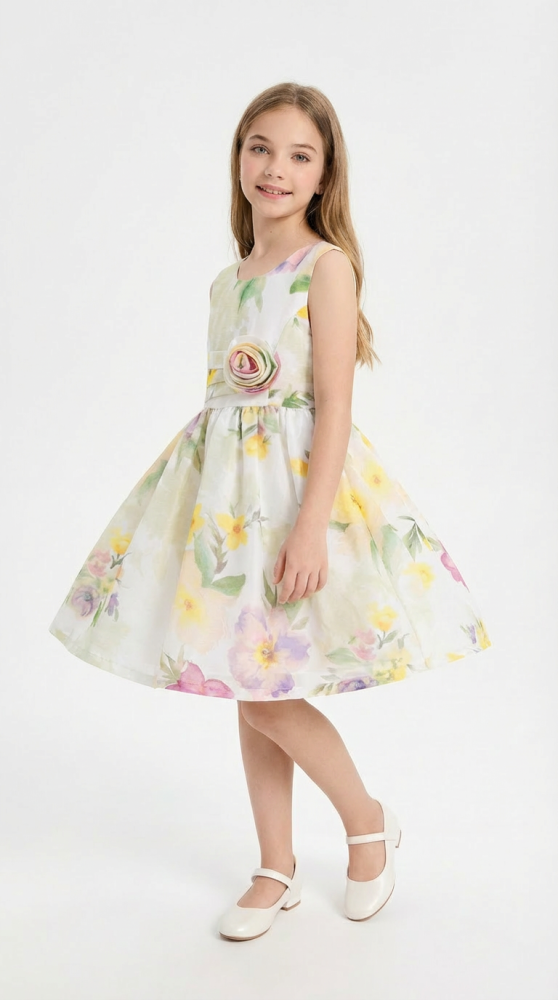 يتميز الفستان بقصّة مريحة وانسيابية تناسب مختلف الأعمار من 4 إلى 14 سنة، مع تفاصيل رقيقة تضفي مظهرًا فخمًا دون مبالغة. يمكن تنسيقه بسهولة مع أحذية وإكسسوارات متعددة ليكون من أجمل فساتين العيد المبهجة أو المناسبات الربيعية، كما أنه سهل العناية والتنظيف ليبقى أنيقًا بعد كل استخدام.