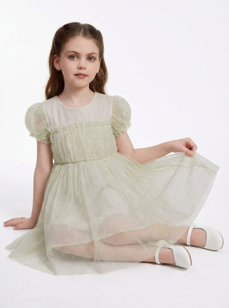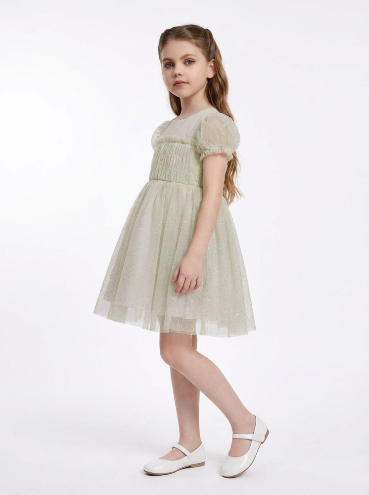 التصميم يحتوي على زمّ في منطقة الصدر يضيف شكلًا مرتبًا للفستان ويساعد على ثباته وراحته أثناء الارتداء، مع قصة واسعة من الأسفل تمنح الطفلة حرية حركة وانسيابية جميلة. الأكمام الخفيفة تضيف توازنًا للتصميم وتحافظ على طابع أنيق ومريح في الوقت نفسه.