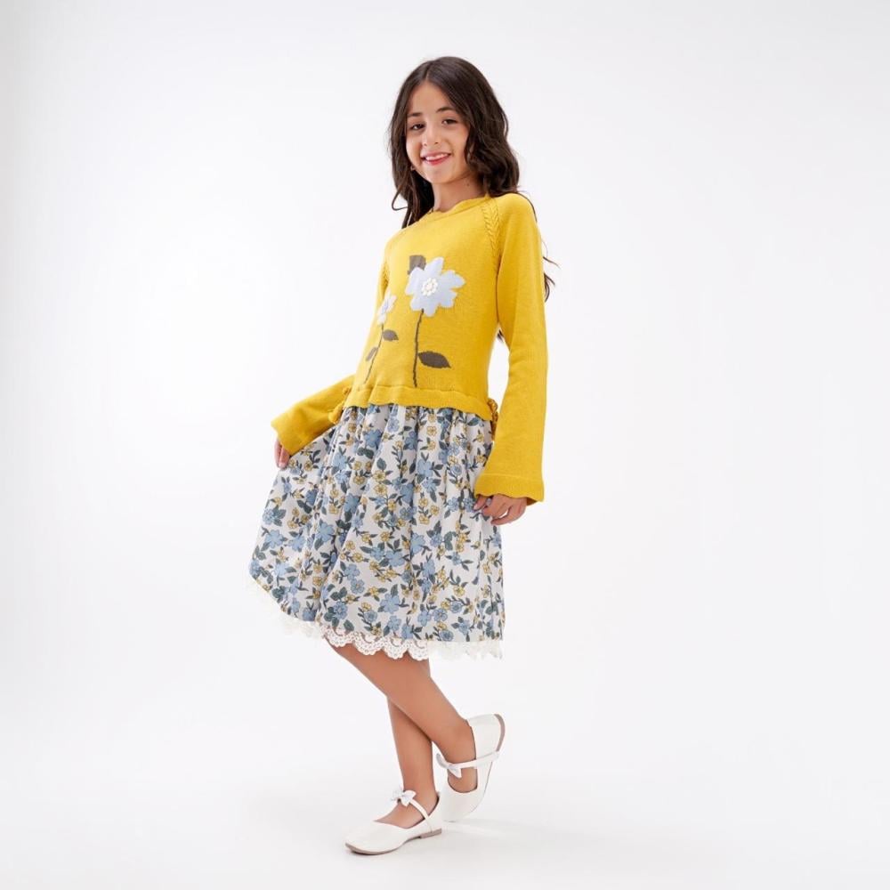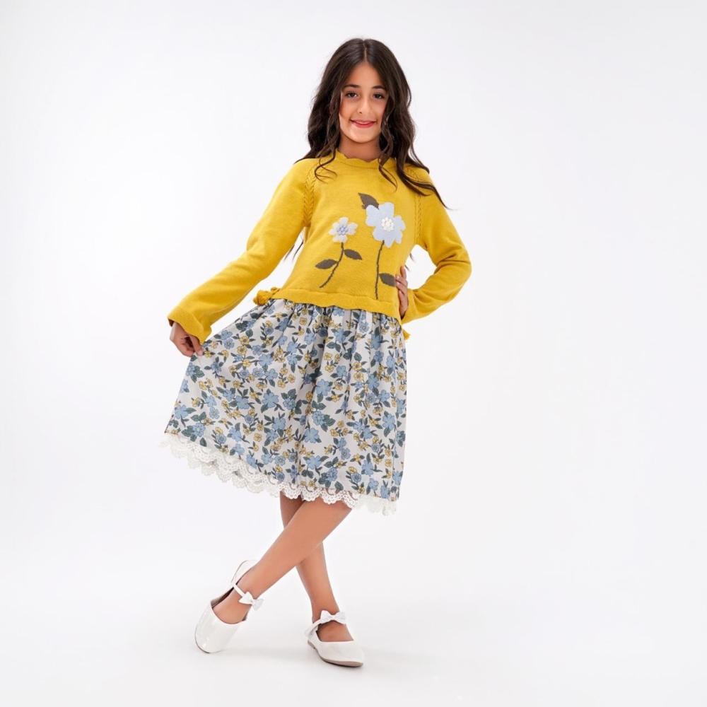 فستان شتوي أصفر أنيق للبنات، يتميز بتصميمه الجميل والمريح. الجزء العلوي من الفستان يأتي بلون أصفر مشرق مع زخرفة زهرية جذابة، بينما يتميز الجزء السفلي بنقوش زهرية تضفي لمسة من الأناقة. الفستان مصنوع من خامات عالية الجودة ليضمن راحة ودفء طفلتك في الأيام الباردة. مثالي للمناسبات المختلفة والإطلالات اليومية. تصميمه الأنيق يجعله خيارًا رائعًا للأمهات اللواتي يبحثن عن أزياء أنيقة وعصرية لبناتهن.