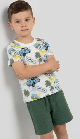 امنح طفلك إطلالة صيفية مميزة مع طقم رحلة الريفييرا الذي يجمع بين تيشيرت أبيض مزين بطبعات مستوحاة من السيارات الكلاسيكية والنخيل، وشورت زيتي عملي بخصر مريح. خامته القطنية الناعمة تضمن راحة الطفل طوال اليوم، مع ألوان هادئة وعصرية تضيف لمسة شبابية للملابس.