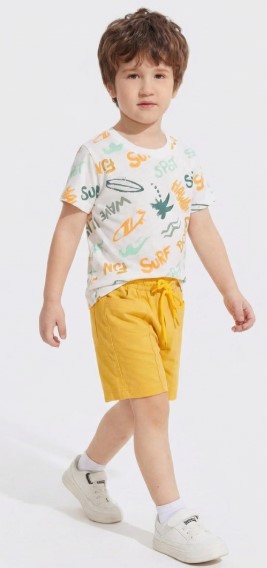 امنح طفلك إطلالة صيفية منعشة مع طقم روح الصيف الذي يجمع بين تيشيرت أبيض منقوش وشورت أصفر عملي ومريح. خامته القطنية الناعمة تسمح بحرية الحركة طوال اليوم، مع ألوان مبهجة تعكس الحيوية والنشاط الصيفي.