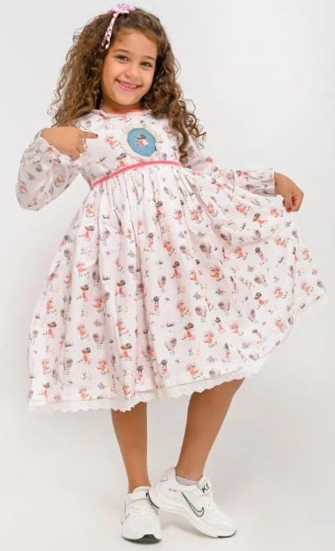 امنحي طفلتك إطلالة مرحة وأنيقة مع فستان بناتي بطبعات لطيفة، مزين برسومات صغيرة تضيف لمسة من البهجة والبراءة. يتميز الفستان بأكمام طويلة وتصميم فضفاض يمنح الراحة، مع تطريز أنيق عند الصدر لإضفاء تفاصيل جذابة ومميزة.