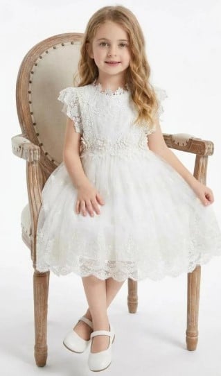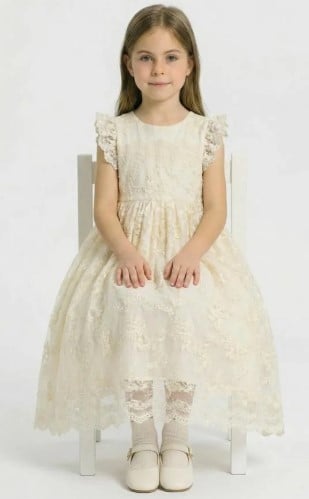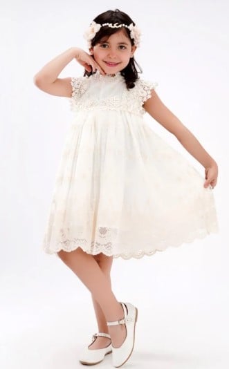 فستان بناتي أنيق باللون الأبيض الكريمي، مستوحى من إطلالة الأميرات والتصاميم الكلاسيكية الراقية، يتميز بتفاصيل ناعمة تمنحه طابعًا ملكيًا جذابًا يناسب المناسبات الفاخرة. القصة الواسعة مع طبقات التل والدانتيل المطرز تضفي لمسة فخامة لافتة.