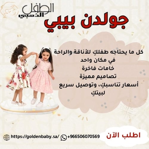 متجر جولدن بيبي يقدم تشكيلة واسعة من فساتين الأطفال الأنيقة والمريحة، مع تصميمات عصرية وجودة عالية تناسب جميع الأعمار والمناسبات.