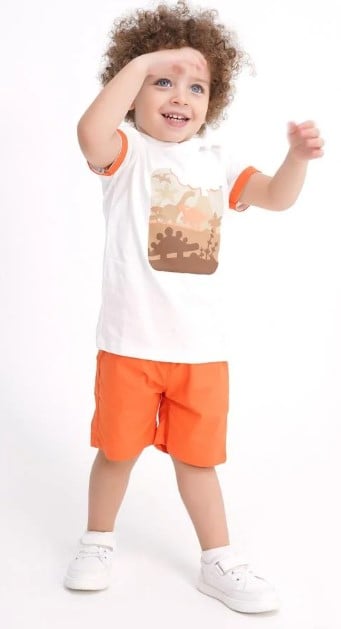 يأتي طقم برمودا أورانجي بتصميم عصري ومبهج يجمع بين الراحة والأناقة، ليمنح طفلك إطلالة مليئة بالحيوية في أيام الصيف. يتكون الطقم من تيشيرت أبيض مزين بطباعة جذابة بألوان دافئة تضيف لمسة مرحة، وشورت بلون برتقالي مشرق مصنوع من قماش خفيف وناعم يمنح حرية الحركة والراحة طوال اليوم.