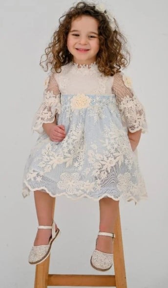 يأتي فستان لؤلؤة الزهور بتصميم راقٍ يجمع بين الفخامة والأنوثة ليمنح طفلتك إطلالة ملكية مذهلة في المناسبات الخاصة. مصنوع من قماش دانتيل فاخر وتول ناعم مطرز بعناية بألوان كريمية وأزرق فاتح تضفي لمسة من الرقي والجمال. يتميز الفستان بقصة مريحة وواسعة مع أكمام شفافة من الدانتيل وتفاصيل ناعمة مثل الوردة الكريمية على الخصر التي تبرز أناقة التصميم.