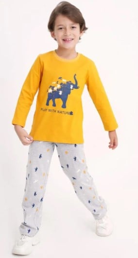 تتميز البيجامة بتيشيرت أصفر بكم طويل مع طبعة فيل مرحة تحمل رسالة تحفيزية، مع شورت رمادي مزين برسومات حيوانات جذابة. هذا المزيج يمنح طفلك إطلالة محببة ويجعل وقت النوم أكثر متعة ومرحًا.