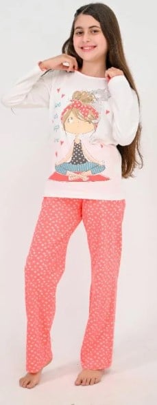 تمنح هذه البجامة طفلتك إحساسًا بالراحة والطمأنينة بفضل القماش القطني الناعم عالي الجودة، مع تيشيرت أبيض بأكمام طويلة مزين برسمة فتاة في وضعية تأمل مع قطة صغيرة، ليضفي أجواء دافئة ومريحة قبل النوم. تصميمها الهادئ يساعد على خلق تجربة نوم مميزة ومليئة بالاسترخاء.