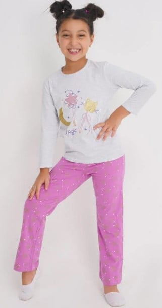يكتمل جمال البيجاما ببنطال أرجواني مزخرف بنجوم لامعة تمنح إطلالة أنثوية جذابة، كما تتميز بمرونتها التي تسمح بحرية الحركة أثناء النوم أو اللعب داخل المنزل. جودة الخياطة وثبات الألوان يجعلانها خيارًا مثاليًا يدوم طويلاً مع الحفاظ على الشكل والأناقة.