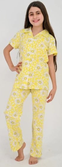 يأتي التيشيرت بياقة V وأكمام قصيرة لمظهر أنيق ومريح، مع بنطال مزين بالكامل بنقوش الأقحوان البيضاء على خلفية صفراء نابضة بالحيوية. اختيار مثالي يجمع بين الجمال الطبيعي والراحة، ومناسب للبشرة الحساسة.