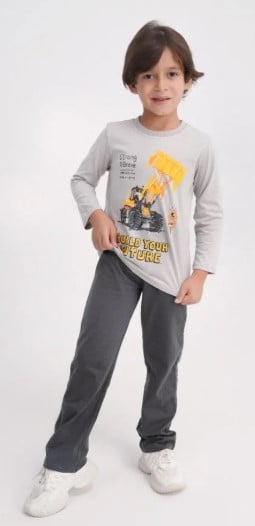 يأتي التصميم بتيشيرت رمادي فاتح بأكمام طويلة مع طبعة حفارة وكلمات تحفيزية “Build Your Future”، مع سروال طويل باللون الرمادي الداكن. اختيار مثالي يجمع بين الراحة والشكل الجذاب ويشجع الطفل على الإبداع والطموح
