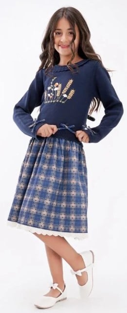 الفستان مصنوع من خامات عالية الجودة توفر الراحة والدفء خلال الأيام الباردة، مع نمط كاروهات جذاب وأكمام طويلة تضيف لمسة فخامة للإطلالة. ويأتي الجزء العلوي باللون الكحلي مع نقش ذهبي أنيق، بينما تمنح التنورة المنقوشة مظهرًا عصريًا يجعله من أبرز موديلات فساتين بناتي 2026 المناسبة للطلعات اليومية والمناسبات الشتوية، مع توفير حرية حركة وراحة كاملة للطفلة طوال اليوم.
