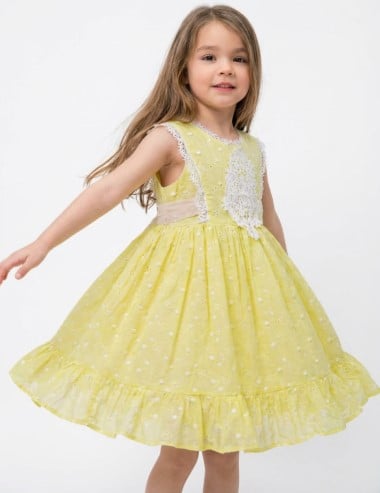 يتميز فستان إشراقة الربيع بلون أصفر ربيعي ناعم وخامة شيفون خفيفة تمنح طفلتك إطلالة مشرقة وأنيقة في جميع المناسبات. التصميم يحتوي على تفاصيل دانتيل أنثوية على الصدر والأكتاف، مع حافة سفلية كشكش تضيف لمسة لطيفة تجعل الفستان مثاليًا للحفلات والأعياد.