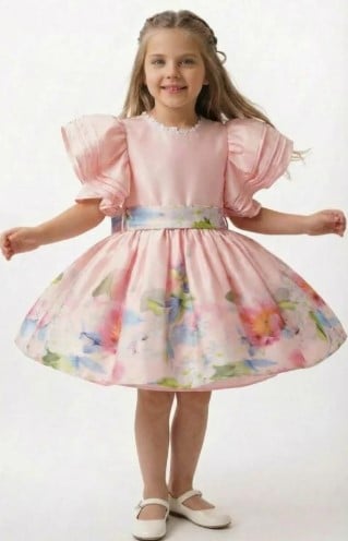 يأتي فستان إيلاريا ضمن تشكيلة فساتين بنات كبار للعيد التي تجمع بين الفخامة والنعومة في كل تفصيلة. اللون الوردي الهادئ مع النقوش الزهرية الناعمة يمنح الطفلة إطلالة أنثوية ملكية، بينما تضيف الأكمام المنفوشة والحزام المزخرف لمسة راقية تضيف شكلًا جذابًا ومتكاملًا.