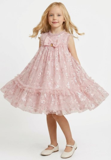يأخذ فستان سحاب تصميمه من خفة السحاب وانسيابيته، مع قماش تول شفاف مزين بنقوش دقيقة لامعة تتوزع برقة على كامل الفستان. اللون الوردي الهادئ يمنح الطفلة شعورًا بالرقة والنعومة، بينما تضيف الطبقات المتدرجة للتنورة حركة خفيفة وانسيابية جذابة عند المشي أو الدوران.