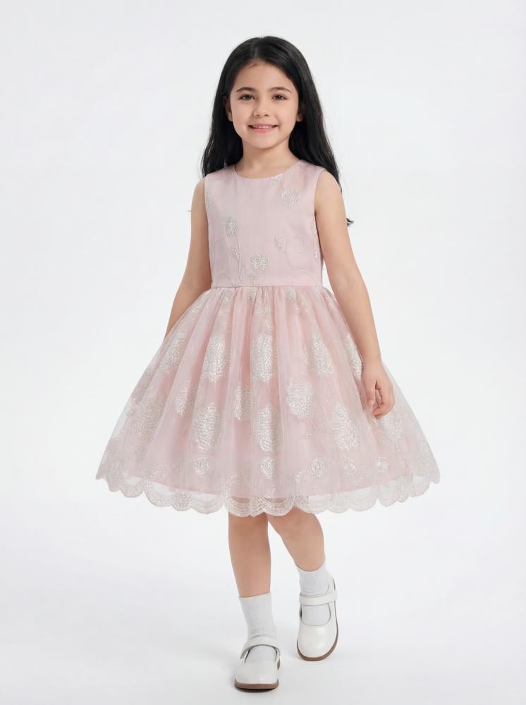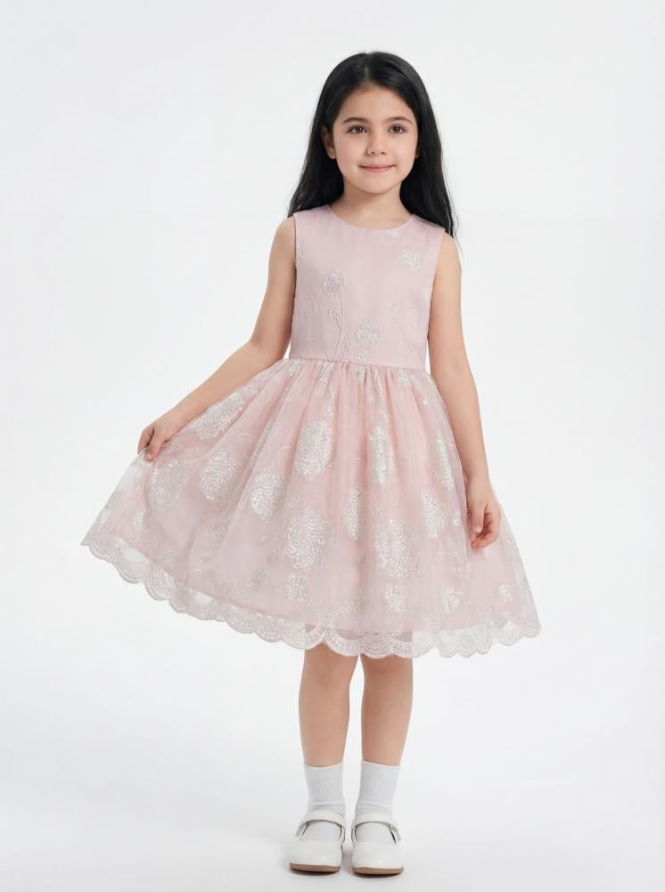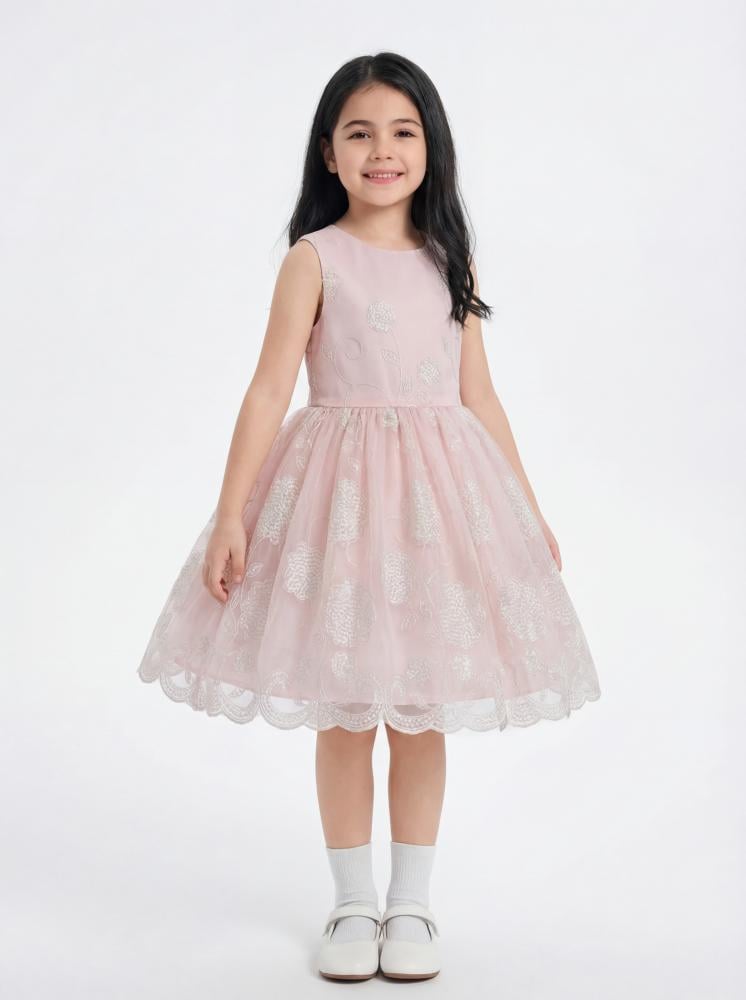 •مصنوع من قماش التول الوردي الفاتح مع تطريزات زهرية بيضاء لإطلالة حالم.