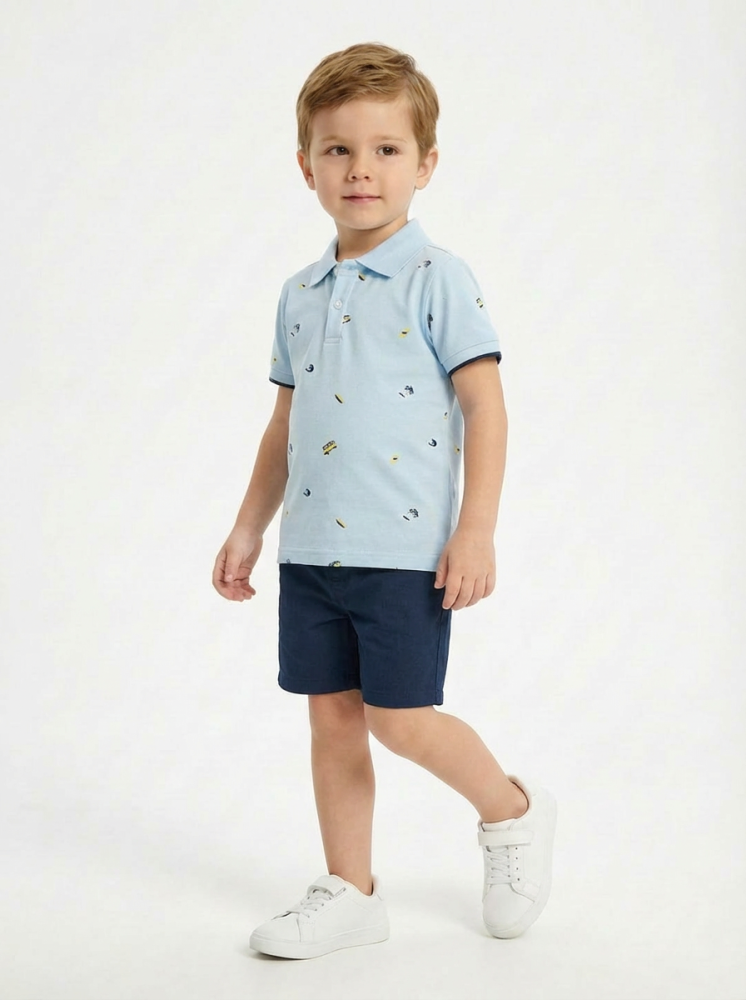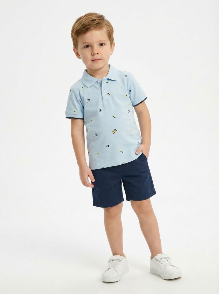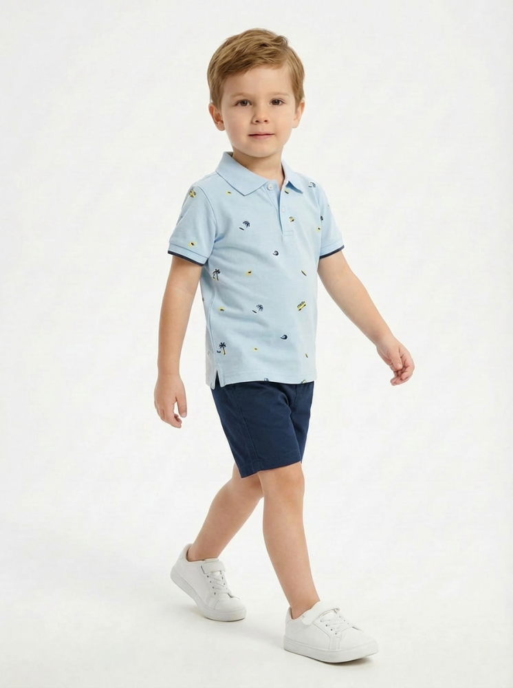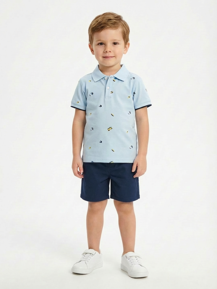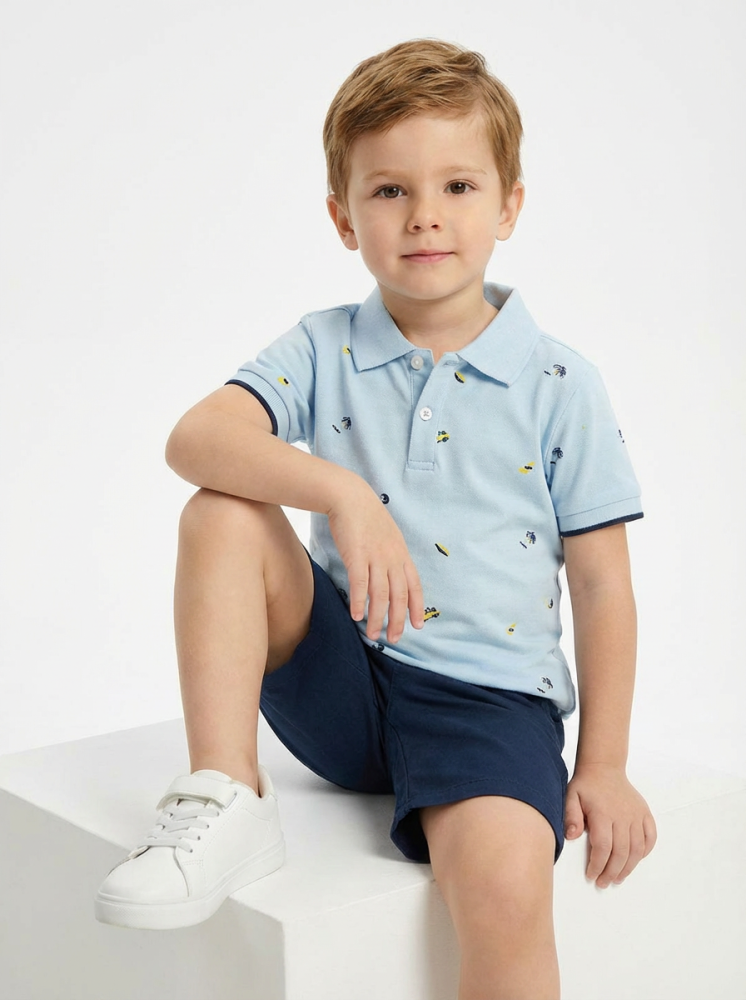 تيشيرت بولو بلون أزرق سماوي بطبعات صغيرة ناعمة تضيف لمسة عصرية، بقصة مريحة وخامة قطنية لطيفة على البشرة.