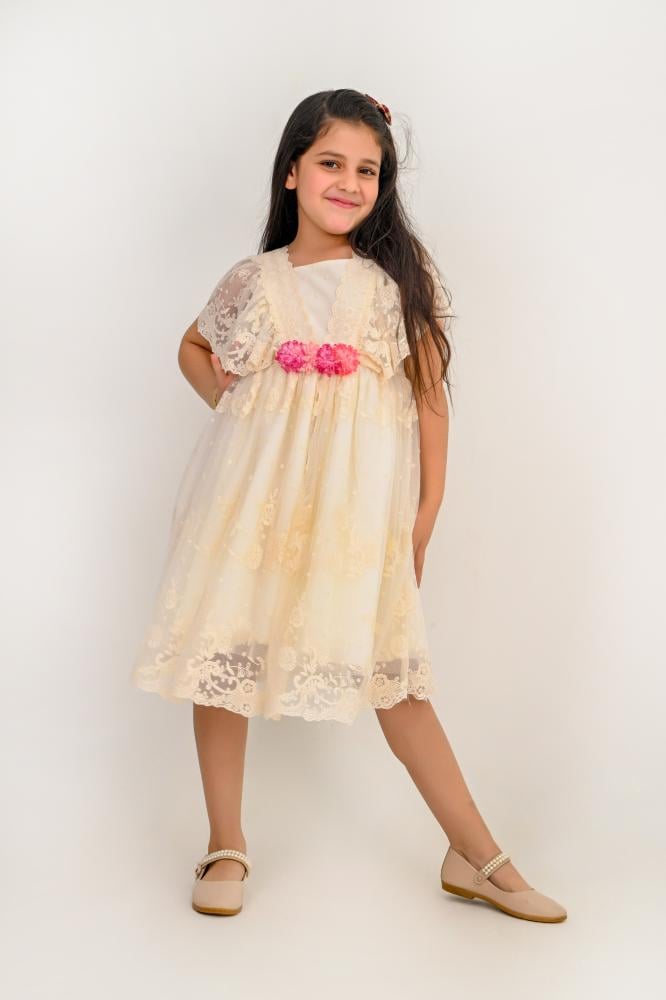 “فستان دانتيل أسر الأنظار بتصميمه الفريد وتفاصيله الراقية. مصنوع من قماش دانتيل فاخر بلون اوف وايت فاتح يضفي لمسة من النعومة والرقي. يزين الخصر أزهار وردية أنيقة تضيف لمسة حيوية للتصميم. تصميمه الانسيابي والخفيف يجعل منه خيارًا رائعًا للمناسبات الخاصة مثل حفلات الزفاف والأعياد. مع هذا الفستان، ستتألق طفلتك بإطلالة مميزة لا تُنسى.