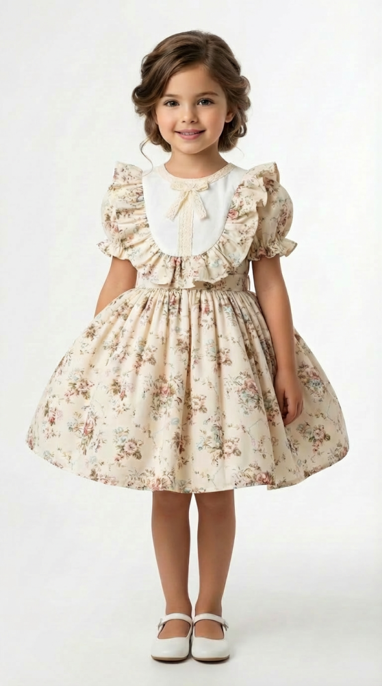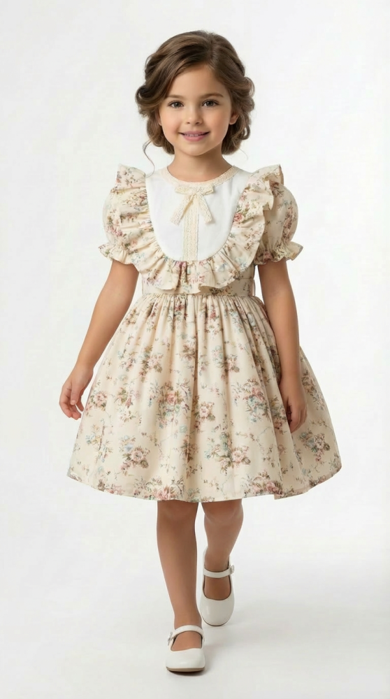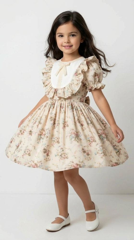 يحتوي التصميم على تفاصيل بسيطة عند الصدر والأكمام تعطي شكلًا مرتبًا وأنيقًا بدون مبالغة، مما يجعل الفستان مناسبًا للأعياد . نقشة الورود الناعمة تمنح الفستان طابعًا كلاسيكيًا محببًا، ويسهل تنسيقه مع أحذية وإكسسوارات مختلفة.