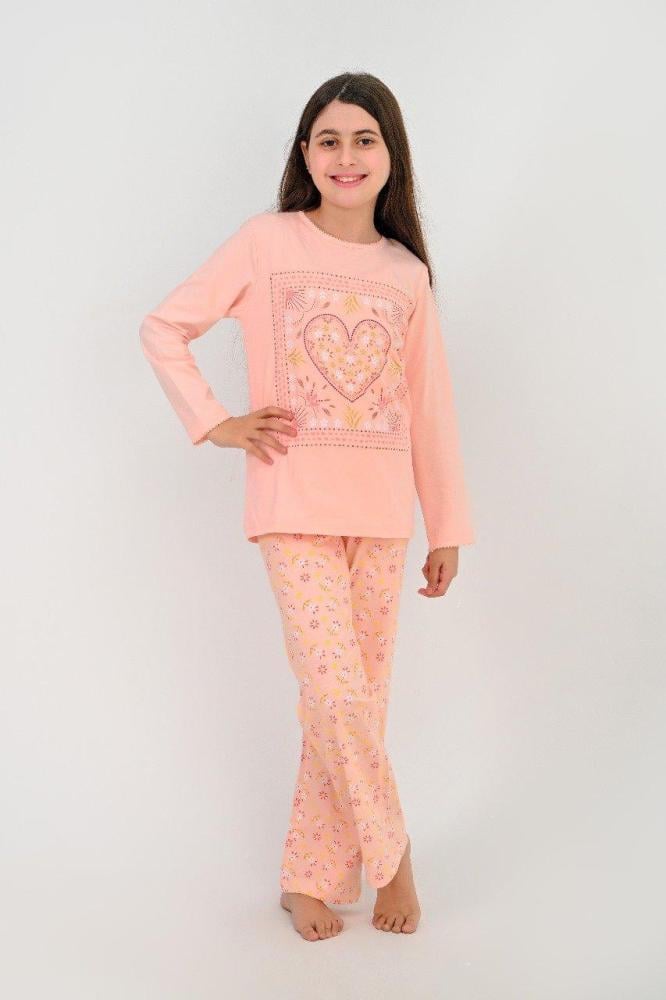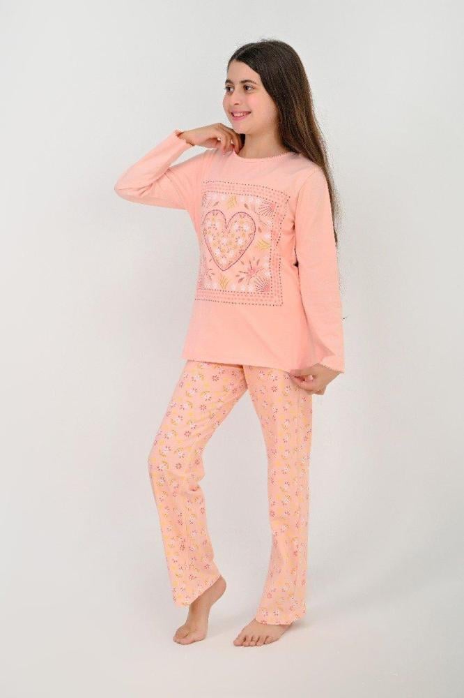 بجامة ناعمة ومريحة مصنوعة من القطن الخالص، تتميز بلونها الوردي الهادئ وتصميمها الرقيق الذي يعكس الأنوثة والدفء. التيشيرت بأكمام طويلة مزين بطبعة قلب مليء بالزهور بتفاصيل جميلة تضفي لمسة من الرومانسية والنعومة. أما البنطال، فهو منقوش بزخارف زهرية صغيرة متناثرة بألوان متناغمة، مما يضفي عليها مظهراً أنيقاً وجذاباً. بفضل قماشها الناعم والمريح، فهي لا تسبب حساسية، مما يجعلها مثالية للبنات الصغيرات للارتداء اليومي أو أثناء النوم.